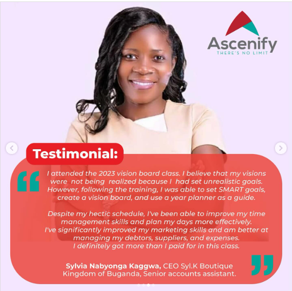 Life comes with lots of responsibility and activity. For my personality type, life can be extremely overwhelming if not well structured. It took me a while to manage my 'busyness' efficiently until the coaches from Ascenify introducd me to the annual planner, specific goal setting and vision board. Ascenify's constant mentorship is invaluable! Today, I'm able to track the progress of my goals with ease and achieve more in less time.